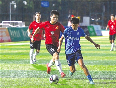 23日,2025武夷山水(南平)城市足球联赛暨南平市足协第五届业余联赛在南平市体育中心迎来冠亚军角逐,最终,政和队获得冠军。本次赛事由南平市体育局、各县(市、区)政府主办,各县(市、区)和武夷新区分别组队参赛。图为政和队(蓝色球衣)与邵武队在比赛中。 (张行健 摄)