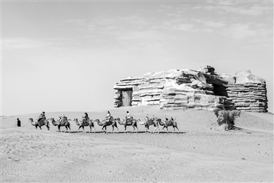 8月12日,在“沙漠之门”景区,游客骑骆驼游览塔克拉玛干沙漠。 “沙漠之门”景区位于新疆维吾尔自治区阿拉尔市,占地面积14万平方米,年均接待游客60万人次。 (新华社记者 刘佳琪 摄)