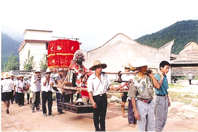 1993年8月24日(农历七月初七),当地民众在新搬迁的居住地首次举行七夕赛蛇神活动。笔者于8月23日到达樟湖坂,次日详细考察了这次赛蛇神活动。整个赛神游行活动跟上述的基本一致。8月24日早上6时左右,先由一人扛上“过山旗”外出“清道”。此人必须先在拟定的赛神游行路线上行走一遍,谓之清道。7时左右,赛神游行队伍从蛇王庙出发。走在最前面的是一个手持火铳的人,一遇岔路口就朝天放铳三响,以示各路神仙暂时回避。此后依次出现的神像有总管、师爷、青龙大将和三眼真人,在师爷神像后面,另有一小木亭,四面遮以纱窗,亭内置一蓄水大盆,内有活蛇一只,苍绿肥大,昂首张望。亭子左右有多人各手执一蛇,或缠或盘,任蛇在身上爬动,其情景与《长溪琐语》所说相同。在三眼真人神像之后,为“连公三兄弟”的神像,其上各置凉伞一把。这七尊神像及“活蛇亭”均由四至八人抬着,其前均有乐手演奏十番乐曲。在连公神像之后,有身着皂吏服装的“皂吏”和肩扛“枷锁”的“赎罪”者。这些戴枷者都是当地民间的许愿者,据说他们为祈求连公赐福免灾祛病,因此以“有罪”人的身份戴枷游行,以求连公蛇神“赎罪”。