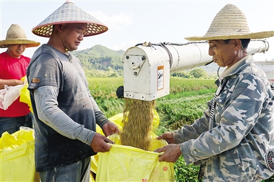 8月26日,在武夷山市兴田镇贤双种植家庭农场,农民将收割下的稻谷装袋。当日,武夷山市农业农村局和兴田镇的农业技术人员对贤双种植家庭农场的甬优1540再生稻进行测产验收,结果显示,该品种头季稻平均干谷亩产为722.3公斤。 (邱汝泉 摄)