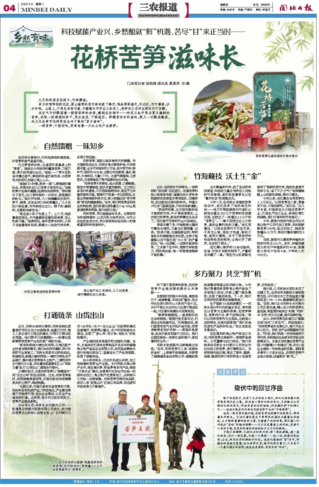 乡愁不再缥缈,已转化为切实行动:修一条机耕路,建一座冷库房,设计一款包装,打通一个渠道……这一切,依靠的是政府、企业、林农扎实的耕耘与付出。这些打基础的“苦”活中,所蕴含的坚韧与智慧,恰如苦笋本身,经历沉淀与蓄力,只为在下一个春天破土而出时,迸发出更清亮、更悠长的“回甘”。
