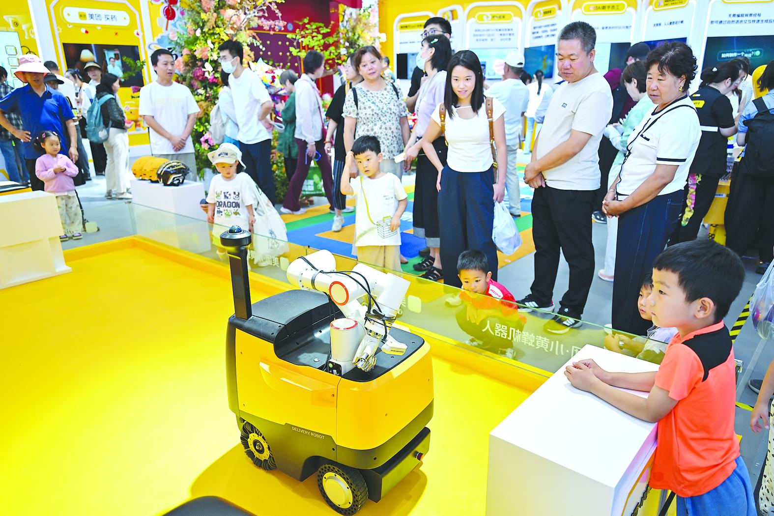 9月14日,观众在服贸会美团展台观看配送机器人。