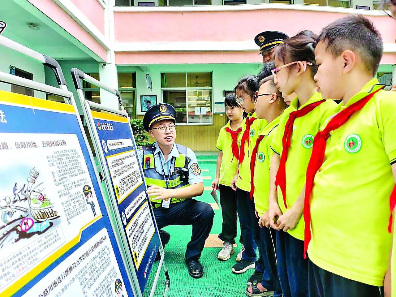 近日,南平高速执法支队一大队联合高速公司延平管理中心到南平市东山小学开展法治宣传,通过自制短视频、彩色宣传图册以及真实案例,生动讲解高速公路安全知识。图为执法人员在宣讲。 (宋琳玲 苏晋垚 摄)