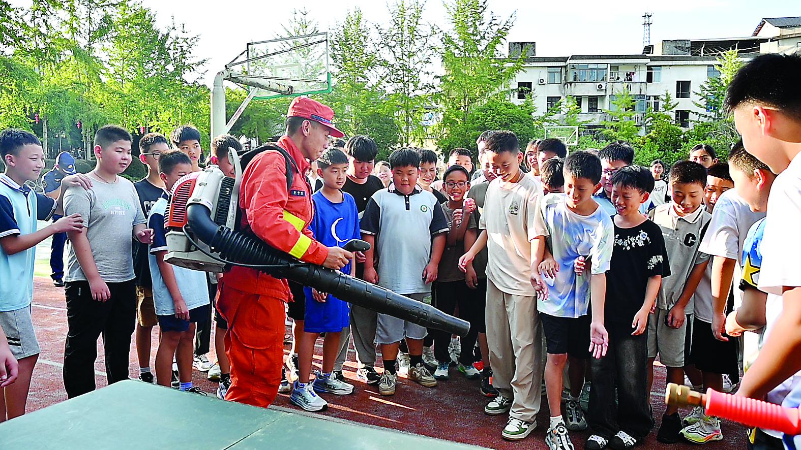 9月3日,武夷山市森林消防大队消防员走进星村中学,通过器材展示、灭火实操、应急疏散演练等形式,为学校师生带来了一堂生动的“开学第一课”。图为消防员向学生展示消防器材。 (张筱惜 罗乐涛 摄)