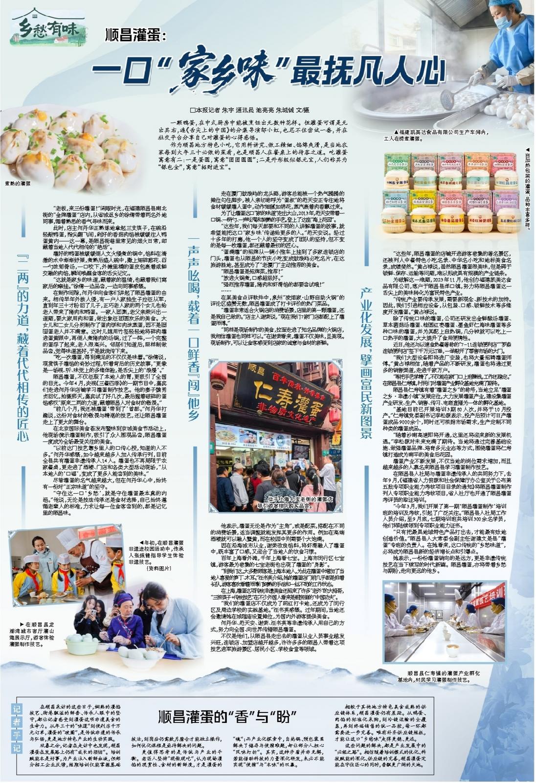 在顺昌采访的这些日子,娴熟的灌馅技艺、街巷飘溢的鲜香、传承人眼中的坚守,都让记者感受到灌蛋这项非遗美食的生命力。从年三十的“味道”到便利店千万元订单,灌蛋的“破圈”,是传统非遗的传承与弘扬,更是地方特色产业的生动实践。