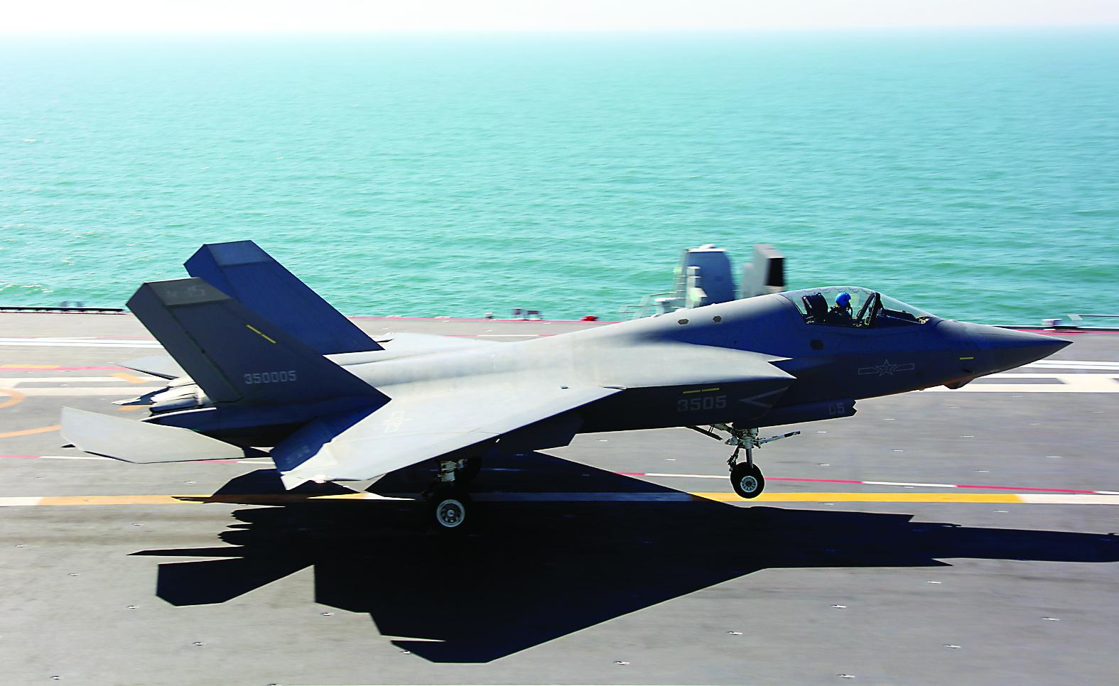 歼-35舰载战斗机在福建舰上开展触舰复飞训练(资料照片)。
