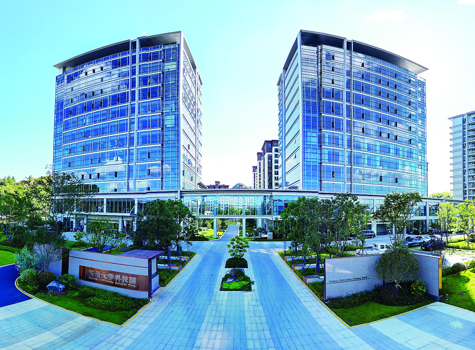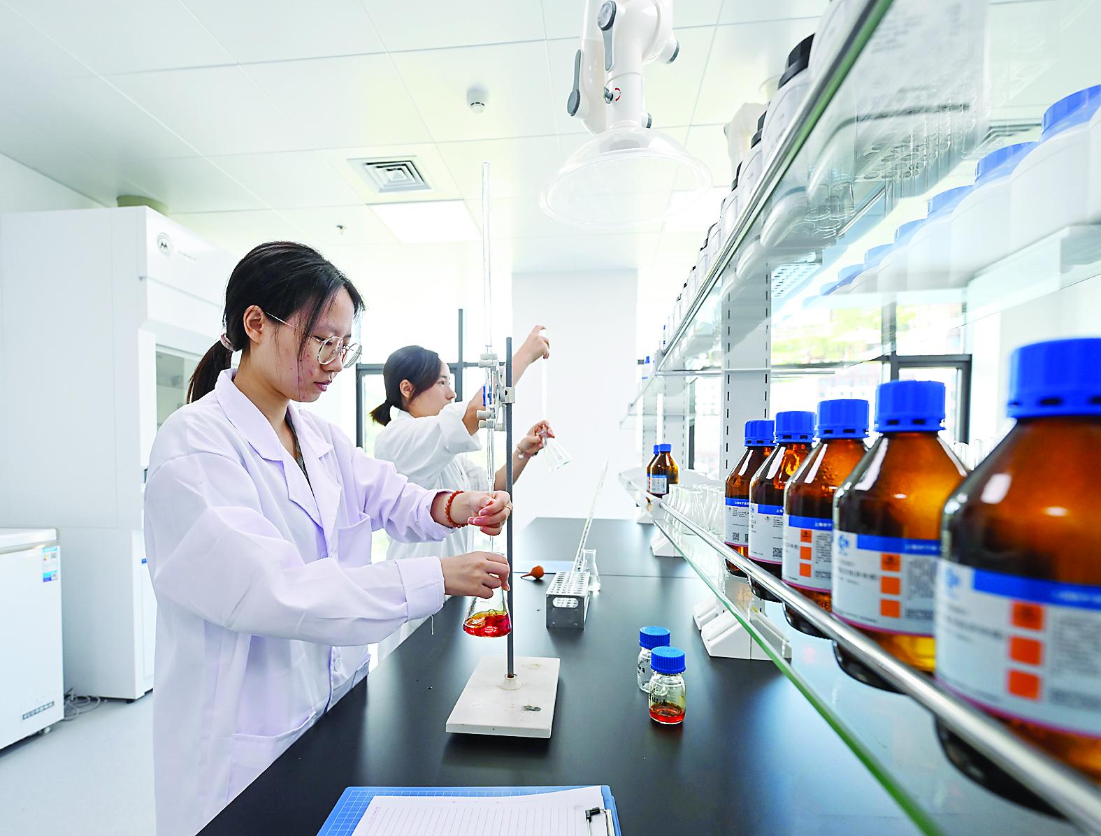 25日,在位于浦城县食品产业园的福州大学科技园,科研人员正在实验室里开展实验(左图)。福州大学科技园总占地面积87亩,建筑面积15.3万平方米,总投资7亿元,是围绕生物医药智能制造和食品加工领域,按照“两地一园,双向奔赴”合作模式打造的校地合作和科技成果转化平台。 (张行健 摄)