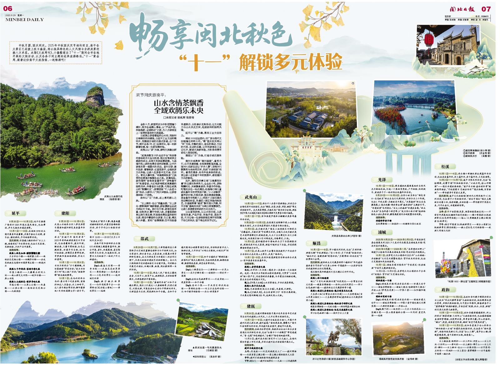 中秋月圆,国庆同欢。2025年中秋国庆双节相约而至,南平各大景区已经披上秋日盛装,将以独具特色的人文风情与自然美景迎接八方来客。本期《文旅周刊》,小编整理出了“十一”期间全市各地开展的文娱活动,以及各条不同主题的经典旅游路线。“十一”黄金周,跟着这份南平文旅指南,一起畅游吧!