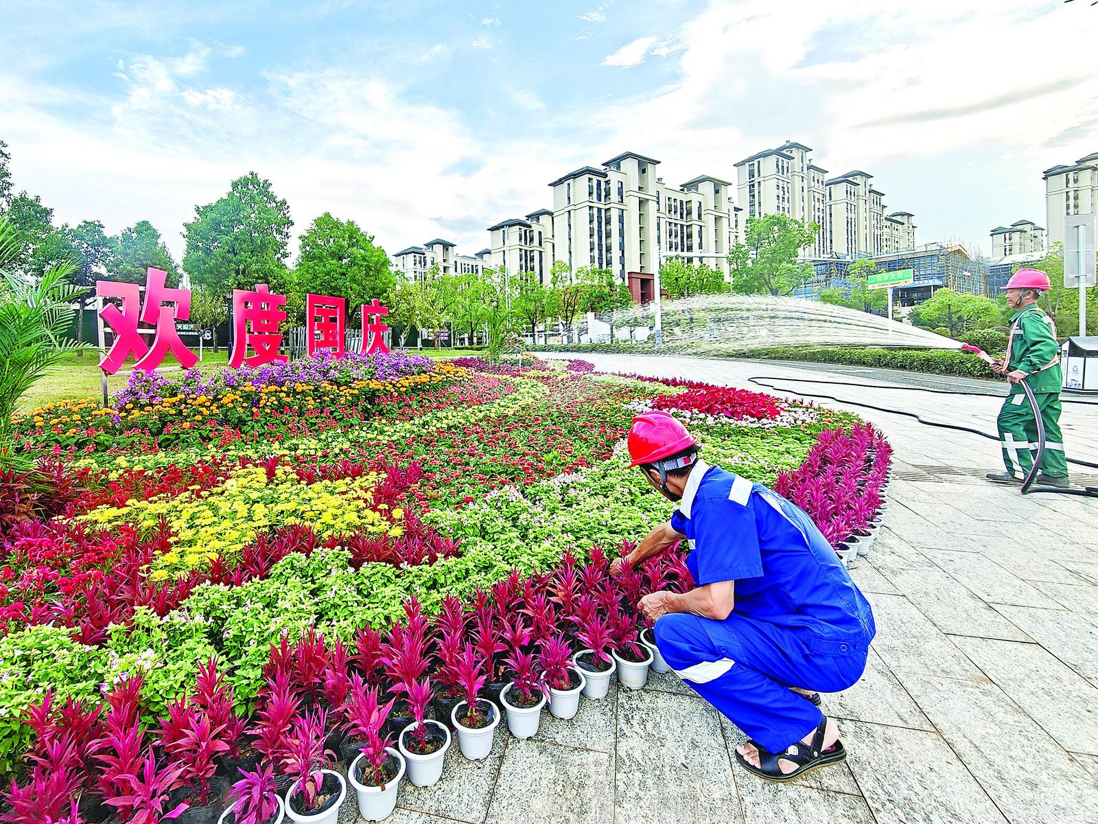 国庆节临近,我市各地通过悬挂国旗、布置主题花坛、举办文化活动等形式营造节日氛围,彰显爱国热情。图为武夷新区一主题花坛,工人正在进行养护。
