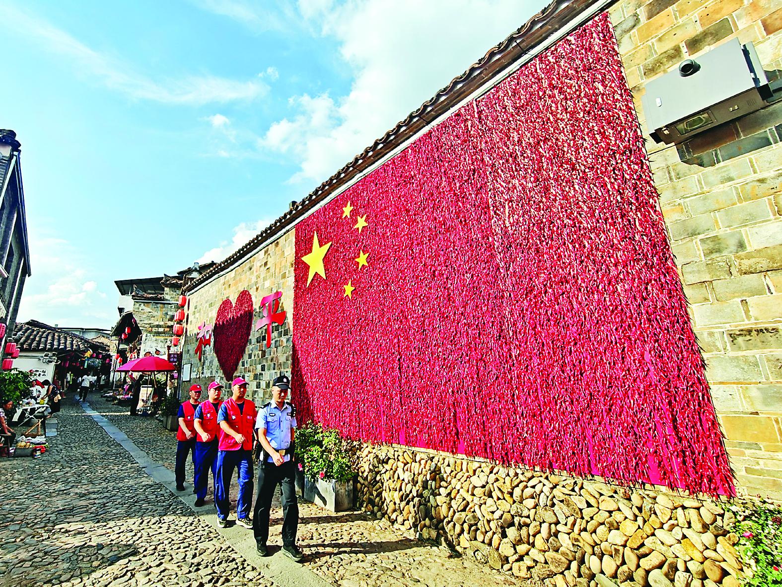 10月1日,“铁城义警”在邵武和平古镇巡逻。国庆期间,这支由和平古镇专职消防队队员组成的“铁城义警”队伍,分组配合和平派出所民警在古镇内巡逻,对古镇景区内乱停车、乱扔烟头等不文明行为进行劝导,维护景区安全秩序。 (朱宇 张莎 摄)