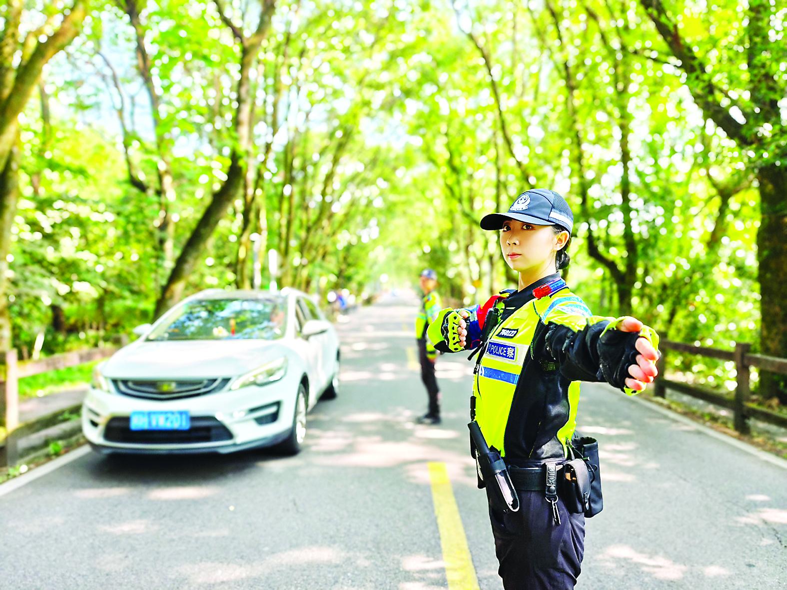 10月1日,武夷山交警全员上岗,以“巡逻防控+指挥疏导+便民服务+宣传引导”多维联动模式,坚守在景区要道、交通枢纽与游客集散点等地,为市民游客编织起一张“安全、有序、畅通、暖心”的国庆出行防护网。图为武夷山交警女子骑警队员在武夷宫景点入口路段执勤。 (林李冰 彭剑伟 摄)