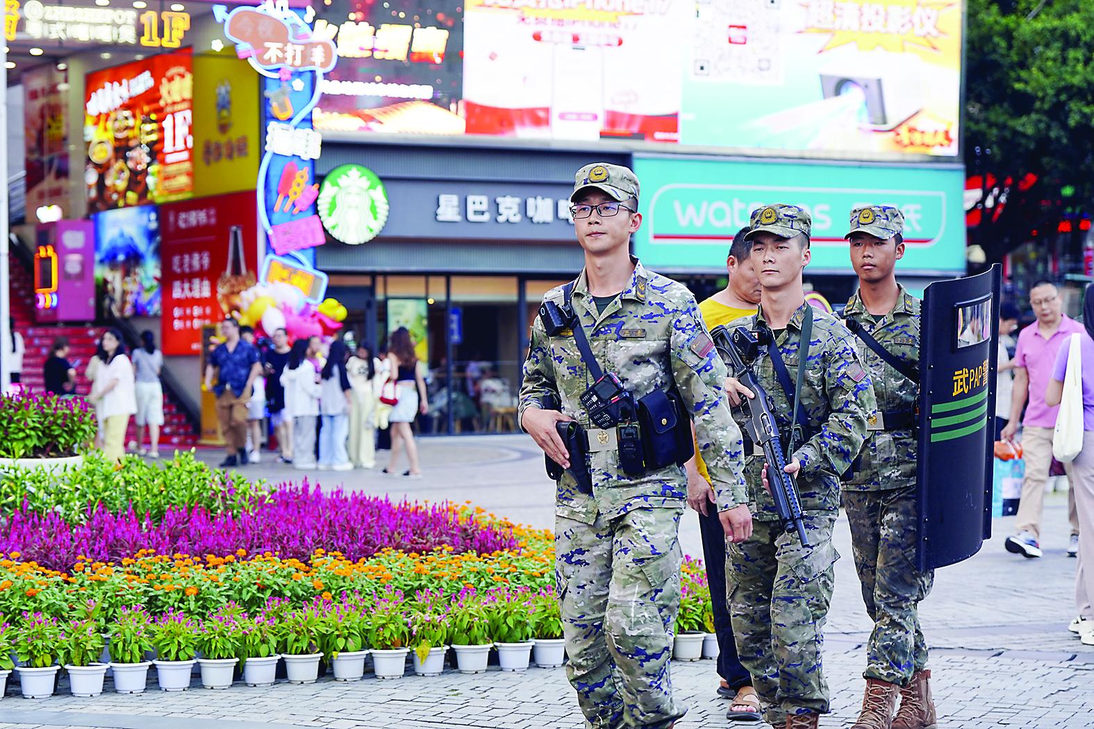1日,武警官兵在延平城区巡逻。国庆中秋长假,武警福建总队南平支队组织官兵在高铁站、闹市区等重点区域开展联勤巡逻,确保节日安乐祥和。 (吴双磊 罗光耀 摄)