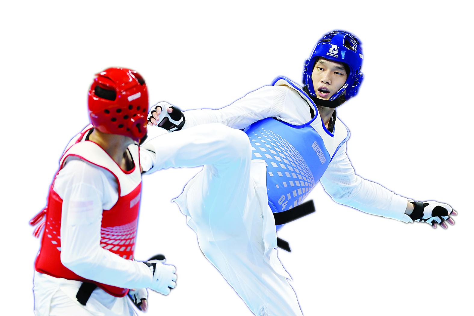 当日,在广东惠州举行的第十五届全运会跆拳道男子80公斤级决赛中,福建队选手项启彰战胜北京体育大学队选手唐皓,获得冠军。 (新华社记者 卢汉欣 摄)