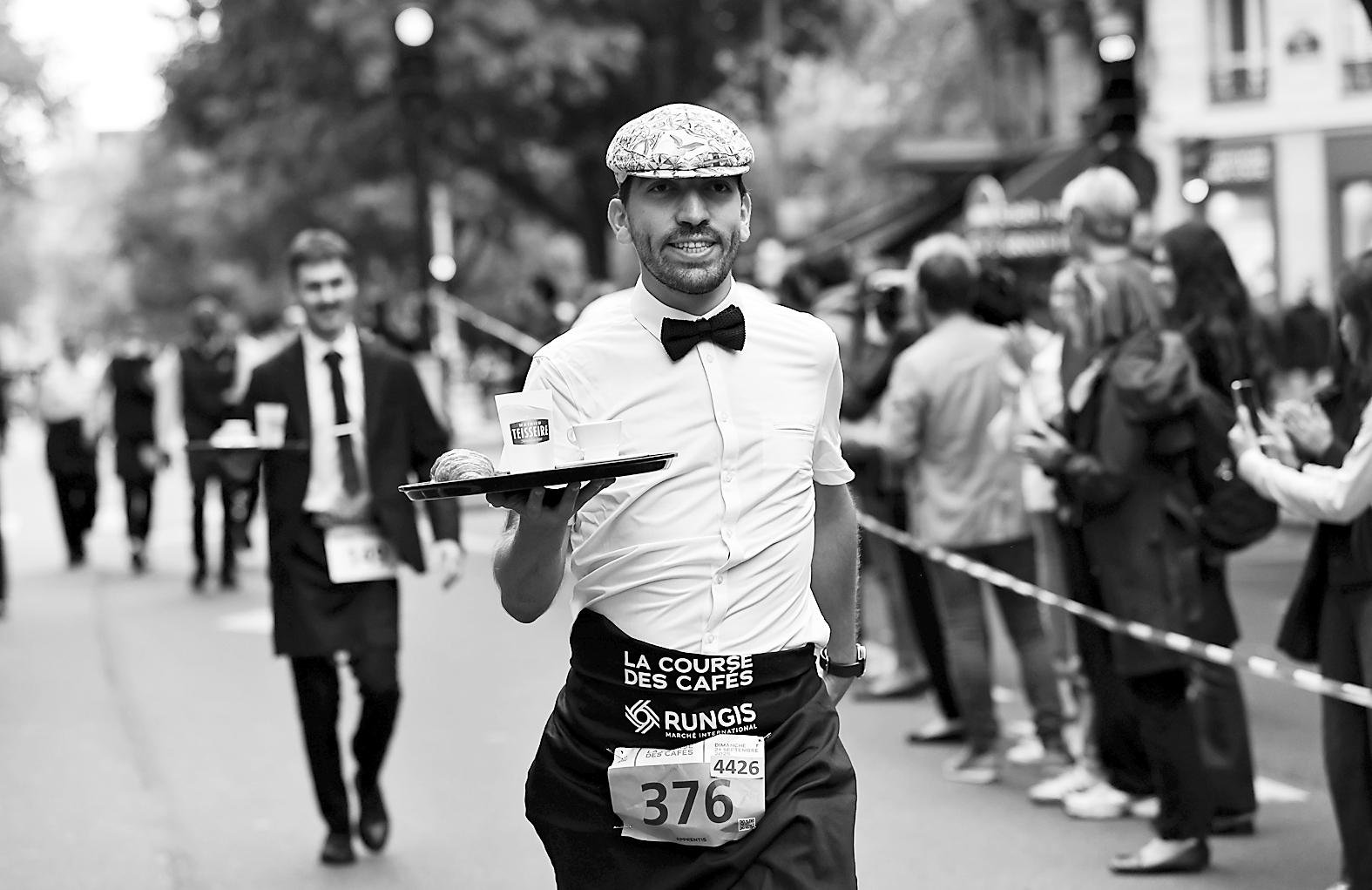 9月21日,参赛者在法国巴黎参加服务员赛跑。