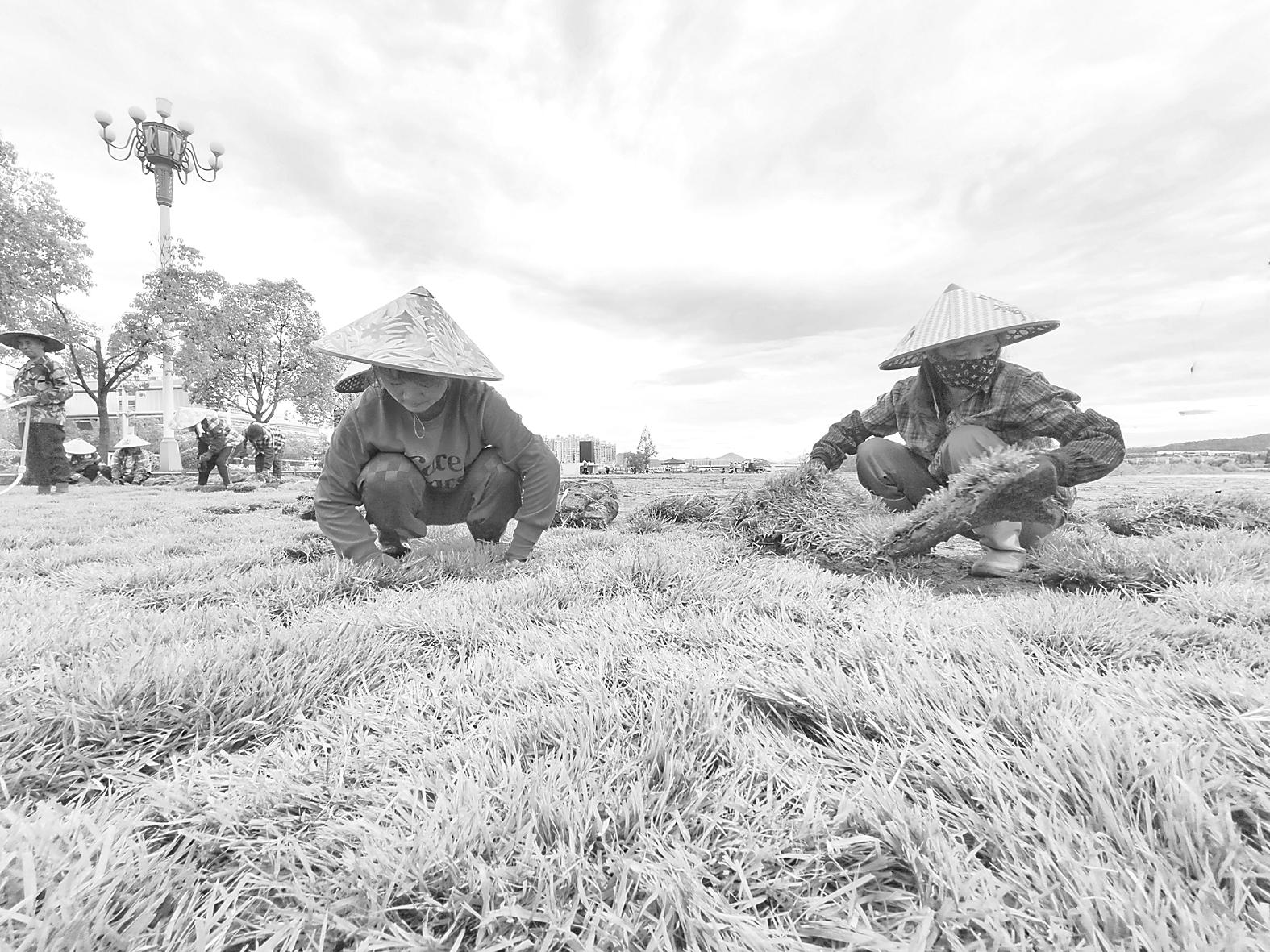 24日,在位于武夷新区的崇阳溪漫游道起终点公园,工人加紧铺设草坪。