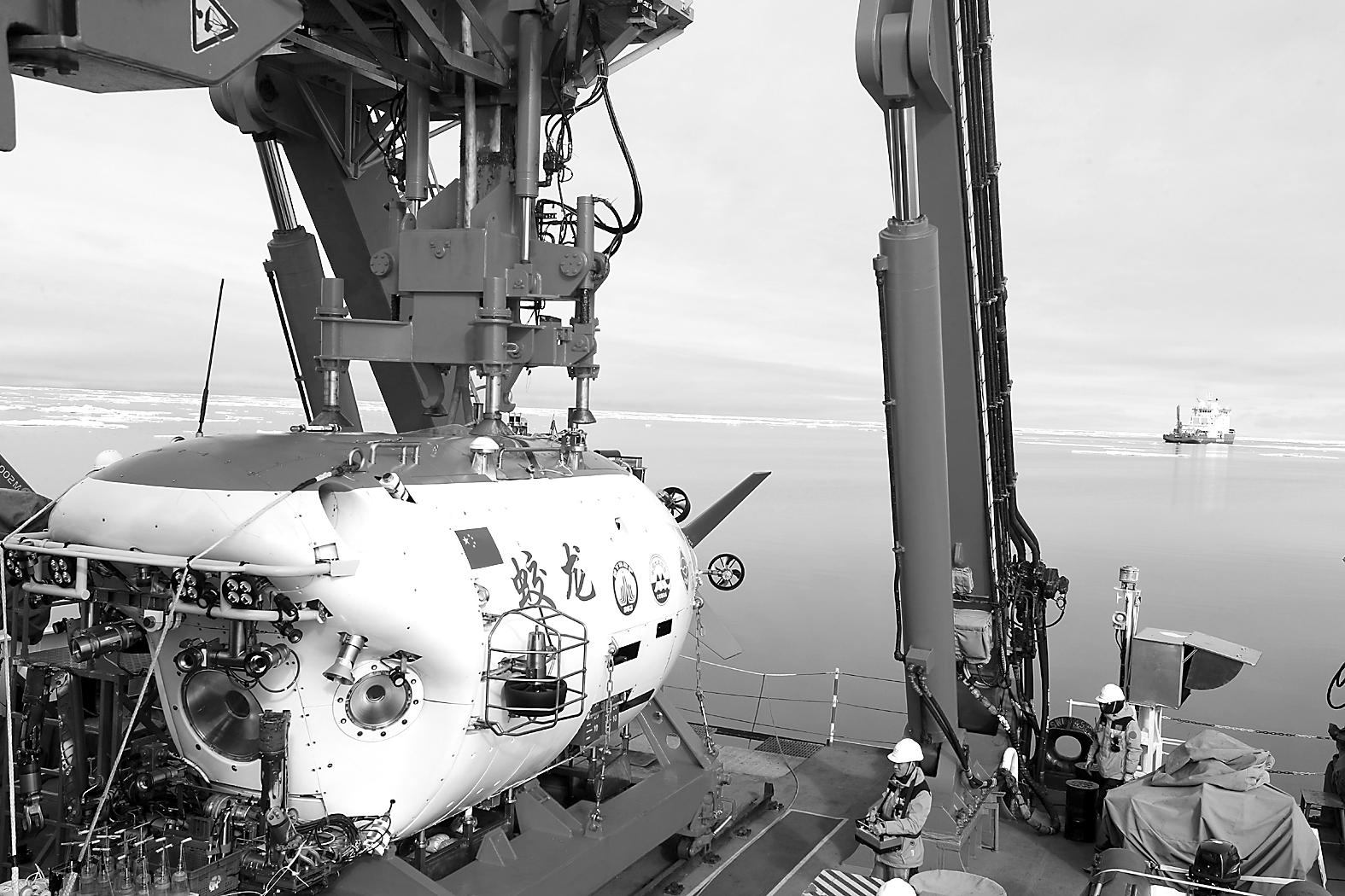 右图:“蛟龙”号准备离开母船“深海一号”(8月6日摄)。