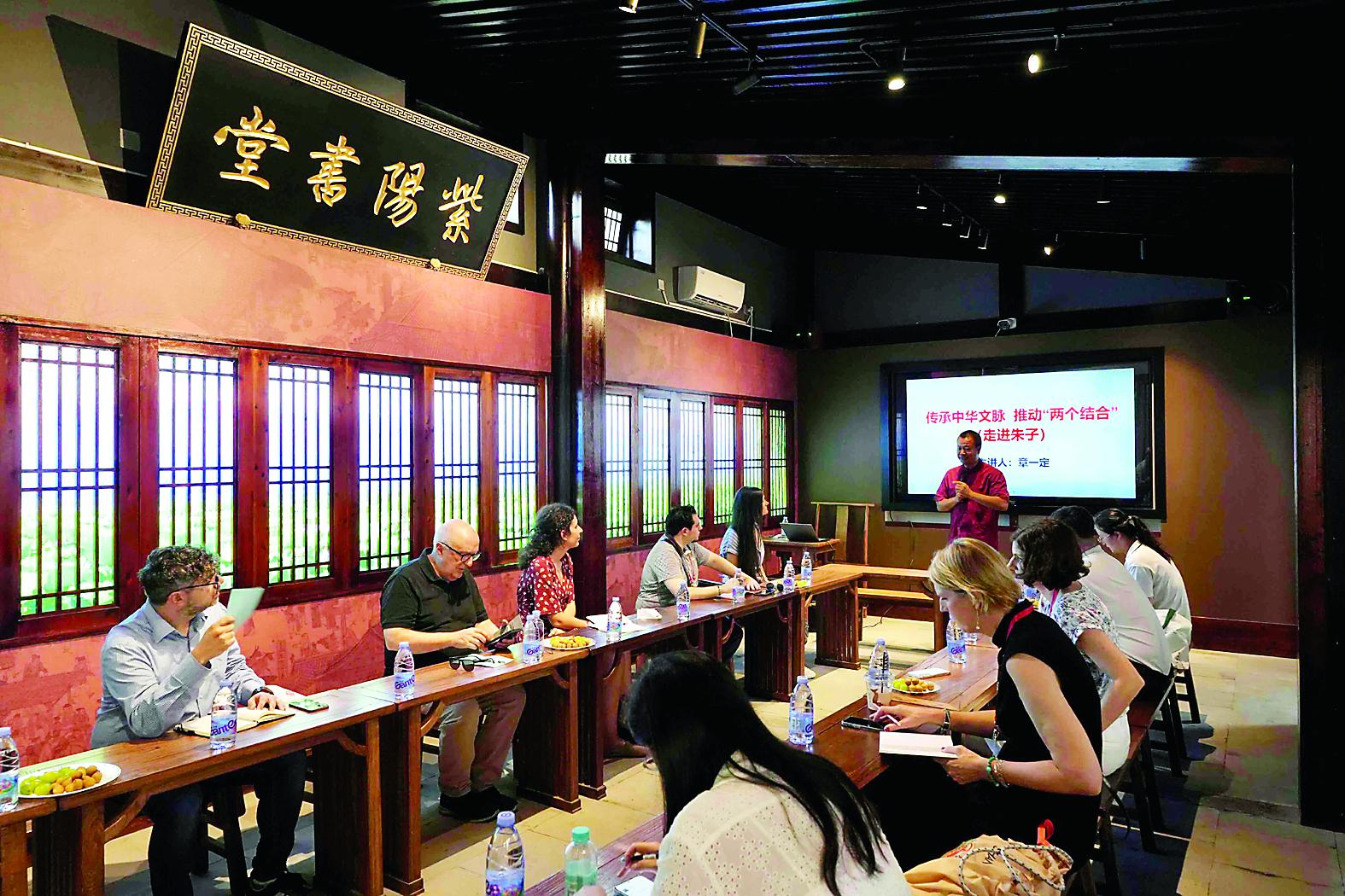 在紫阳楼的紫阳书堂,五夫同文书院院长章一定围绕《传承中华文脉 推动“两个结合”》这一主题,以专题讲座与学术研讨结合的方式,引领汉学家们深入研习朱子的理学体系与教育思想,共同探讨其在跨文化语境中的传播路径与实际影响。通过多维度、多层次的交流互动,汉学家们进一步深化了对朱子文化内涵与时代价值的理解,更加系统地把握了其中蕴藏的思想精髓。