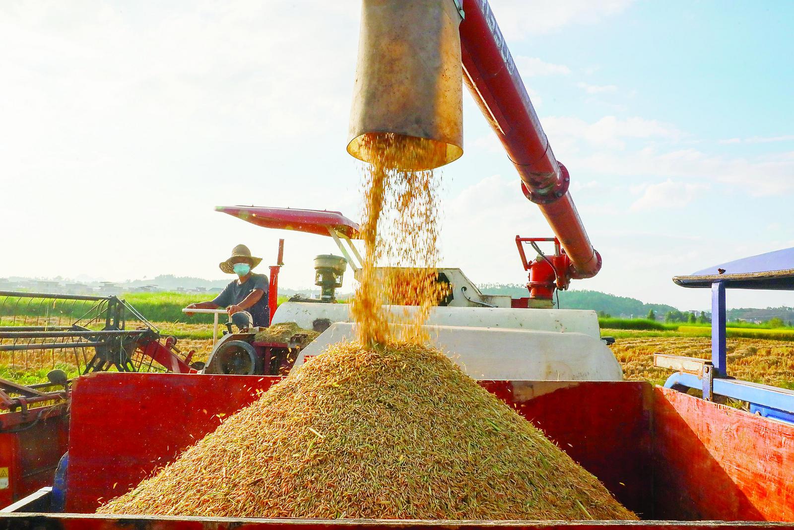 10月15日,在湖南省永州市新田县新圩镇上禾塘村,村民驾驶收割机收获晚稻。农业农村部最新农情调度显示,2025年全国秋粮收获近七成。 (新华社发 刘贵雄 摄)
