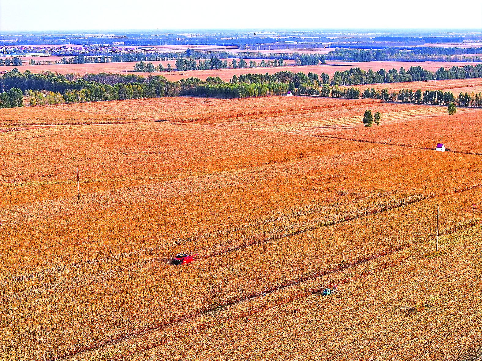 10月14日,在通辽市科尔沁区丰田镇,农机手驾驶收割机收割玉米(无人机照片)。