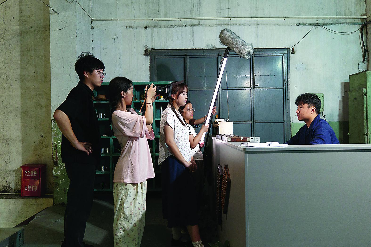 在南纸1958工业记忆馆二楼,阳光学院学生拍摄短剧。