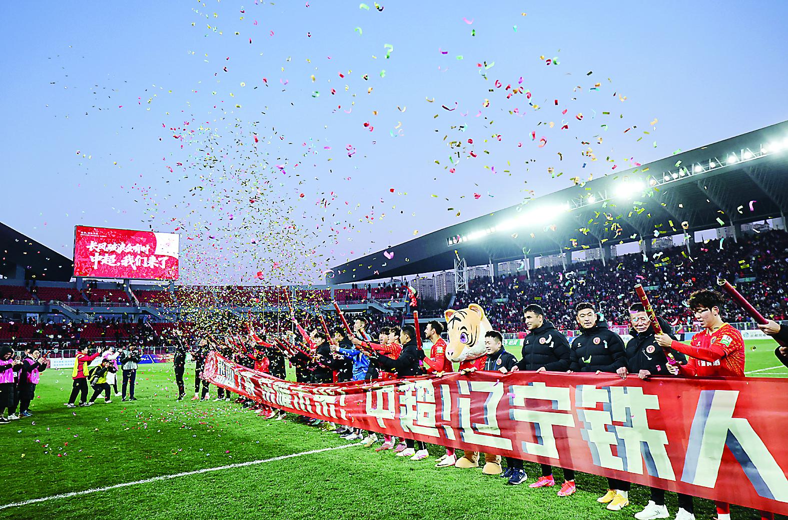 “中超我们回来了”“我们是冠军”的巨幅标语随风舒展,辽宁铁人队的队员们登上花车,面对近三万名观众的欢呼,鞠躬致意,庆祝一场等待了八年的胜利。