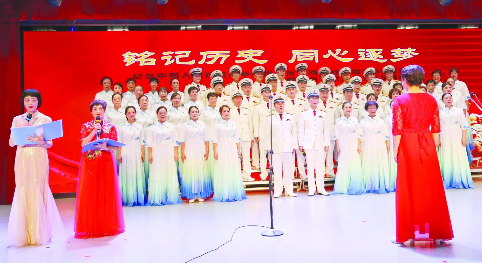 百合艺术团的成员们正在表演大合唱《在太行山上》。