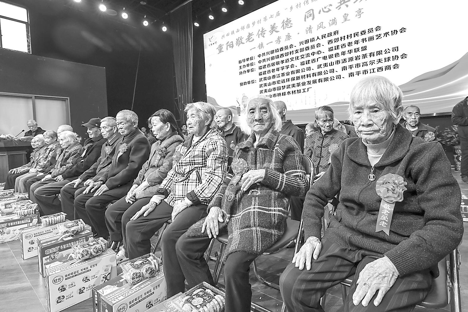 10月29日,武夷山市兴田镇西郊村举行第七届“乡村传统孝道文化节暨九九重阳节”,给全村老人们过一个温馨的节日。图为20多位80岁以上老人收到慰问品。