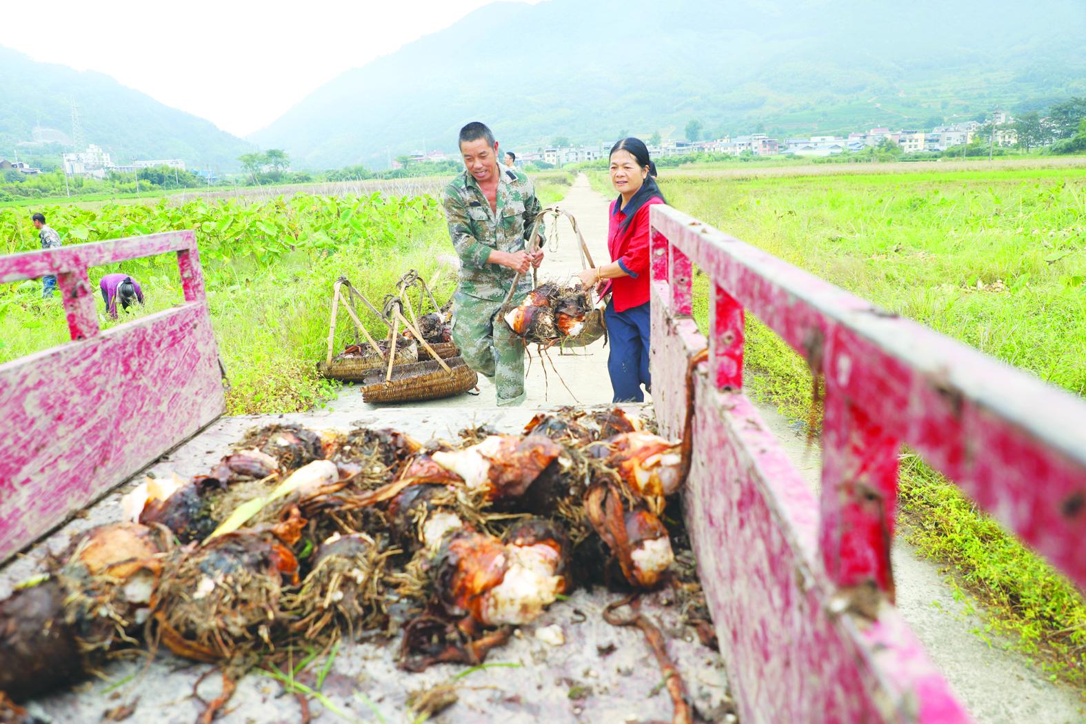 胡刚枝(右)与农户一起将采挖出的槟榔芋装载上车。