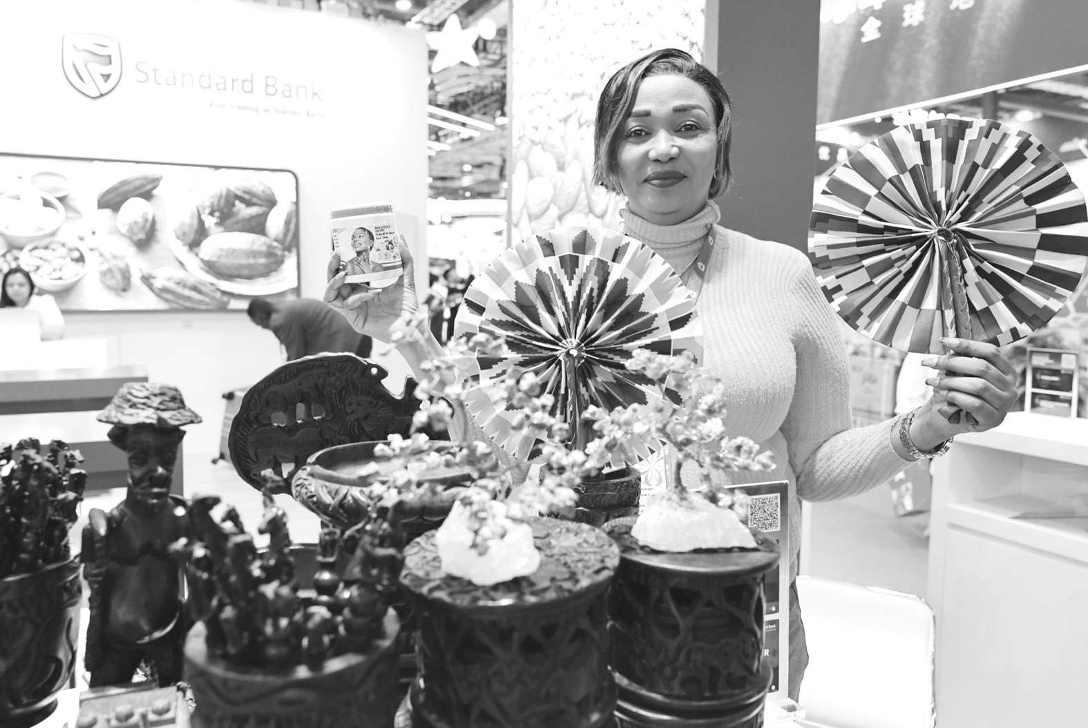 11月7日,在第八届进博会农食产品展区,来自加纳的展商展示当地特色折扇和牛油果润肤乳。