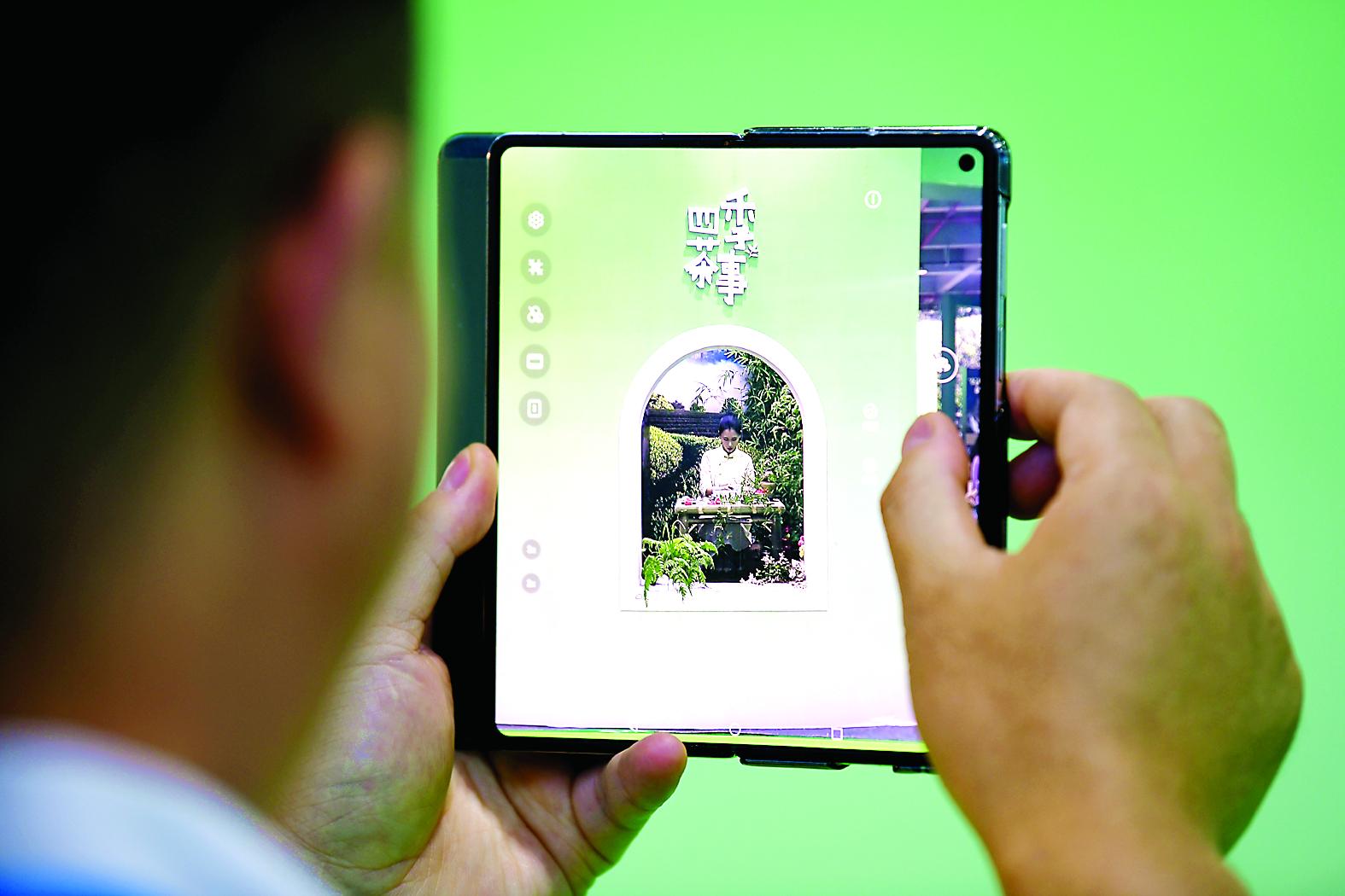 一名游客在四季茶事馆前拍照打卡,人在画中的意境令人赏心悦目。 (郑金富 摄)