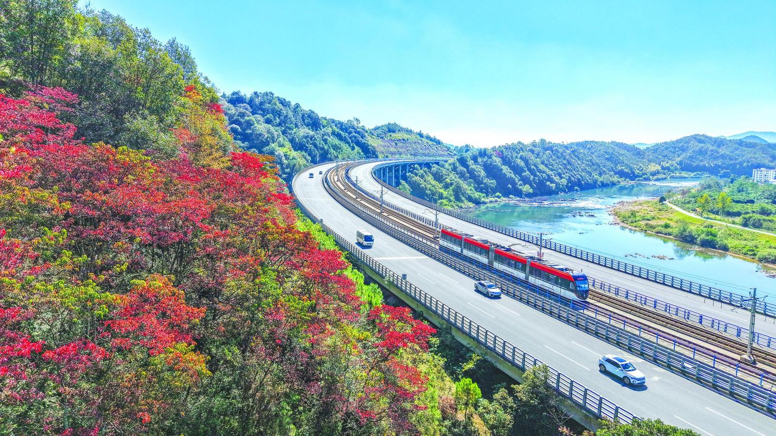 19日,汽车与轻轨列车行驶在省道303线建阳至武夷山段。该路段风光秀丽,“车在景中行,人在画中游”的诗意美景引人入胜。 (朱宇 摄)