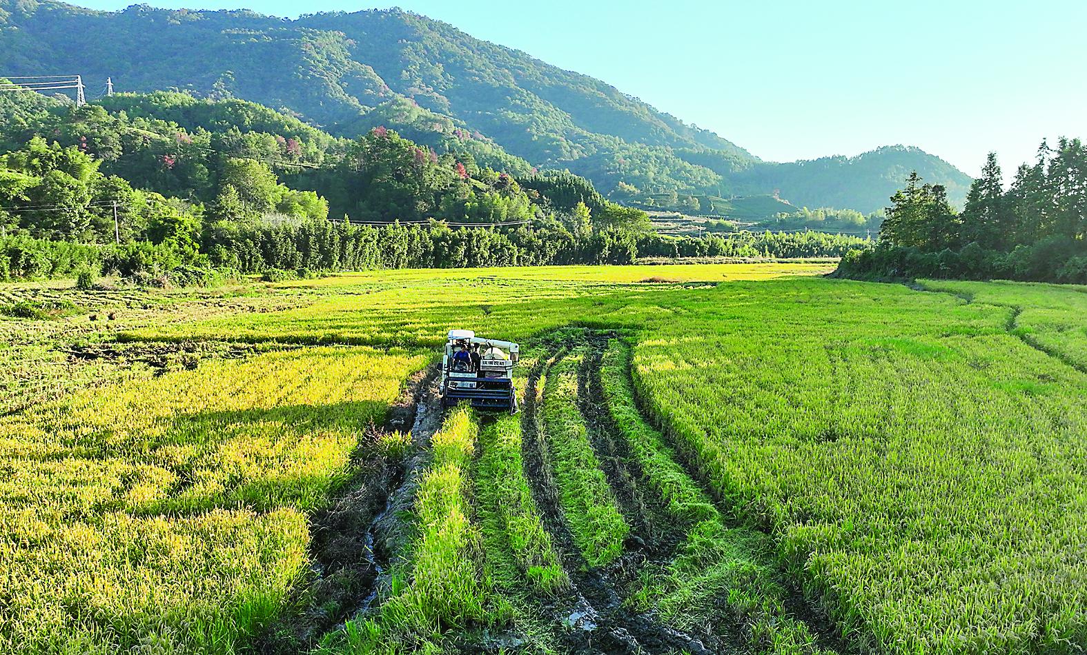 日前,在武夷山市兴田镇张赵翰粮种植家庭农场,收割机来回穿梭,收割再生稻。