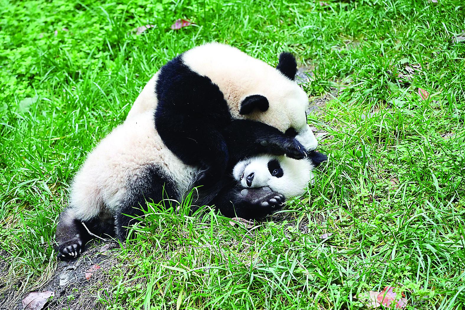 图为11月6日,在中国大熊猫保护研究中心神树坪基地,大熊猫“灿阳”(上)和“青阳”玩闹。 (新华社记者 胥冰洁 摄)