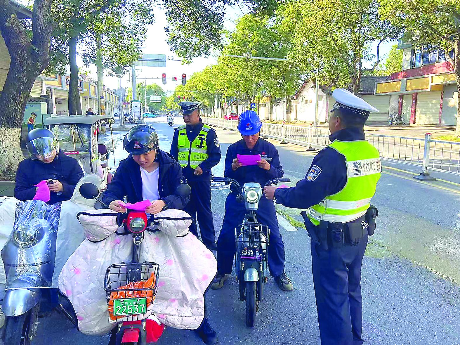 连日来,邵武市公安局交警大队在辖区开展电动自行车专项整治行动,进一步规范城区道路交通秩序,消除路面安全隐患。《福建省非机动车管理办法》实施以来,邵武市公安局交警大队在全市范围内组织开展电动自行车整治百日行动,针对城区重点区域主干道、城乡结合部等人流密集区域,严查不戴头盔、无牌上路、逆行、不走非机动车道、非法改装等违法违规行为。图为民警开展现场普法。