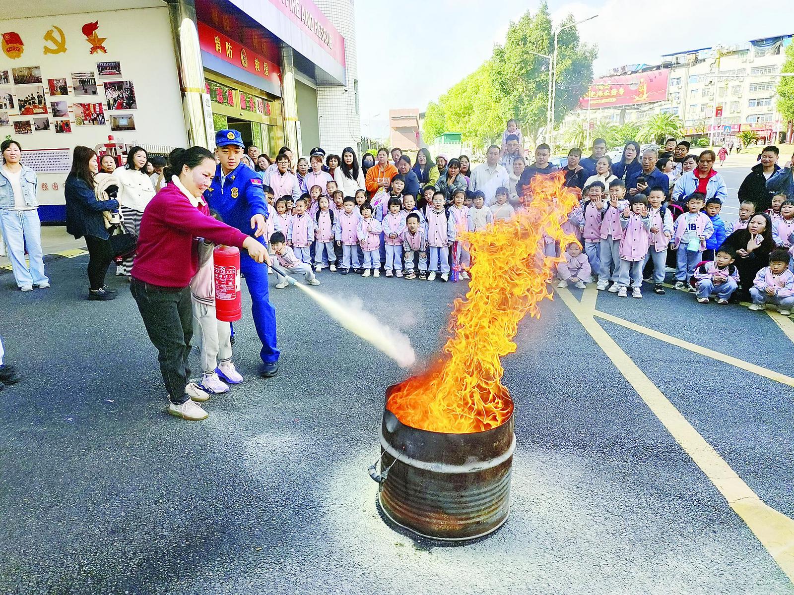 11月14日,建瓯市金苹果幼儿园120多名师生和家长走进建瓯水西路消防救援站,近距离学习消防、参与消防、体验消防。图为实操环节,消防员演示灭火器的操作步骤和初起火灾扑救方法,并指导师生和家长开展灭火演练。 (王缨 刘华钦 摄)