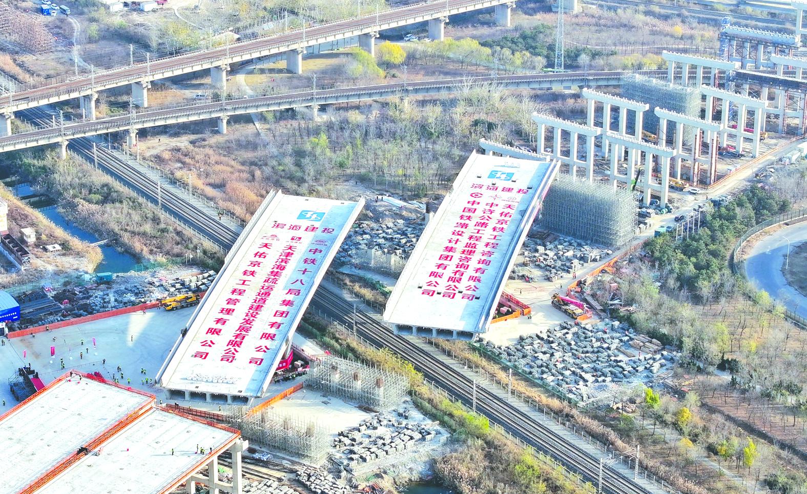 11月26日拍摄的兴港高速上跨津山铁路转体桥施工现场(无人机照片)。当日,由天津滨海建投基建管理有限公司负责建设的兴港高速上跨津山铁路转体桥工程完成转体施工。工程承建方中铁十八局仅耗时约1小时便将两座重1.4万吨的转体连续梁,同步顺时针旋转60余度实现“完美转身”。