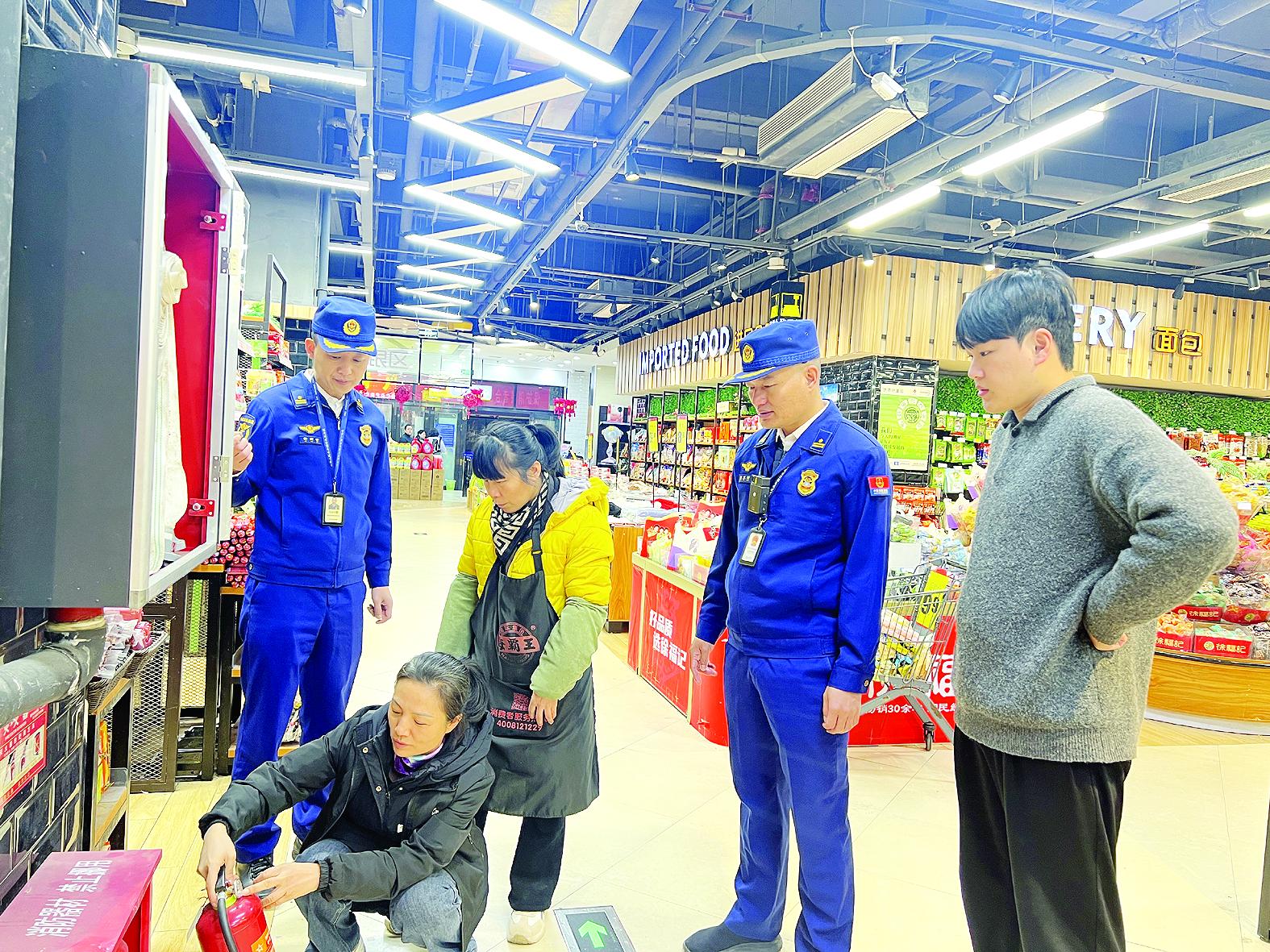 近日,邵武市消防救援大队到辖区人员密集场所开展消防安全隐患检查,重点对各场所的消防安全管理制度是否严格落实、消防器材配备是否齐全并完好有效等情况进行了实地检查,确保辖区消防安全形势稳定。图为消防指战员在超市检查消防器材。
