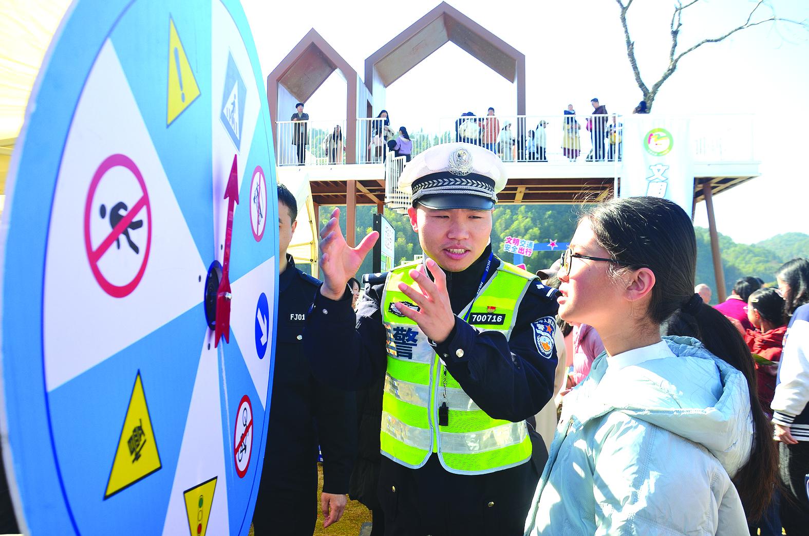 11月29日,南平市道安办、南平市委文明办、南平市公安局、建阳区道安办联合在建阳举行以“文明交通 礼行天下”为主题的“全国交通安全日”主题宣传活动,进一步增强全民交通法治理念,倡导文明出行。图为市民参与标识普法挑战互动游戏。 (余雅丽 摄)