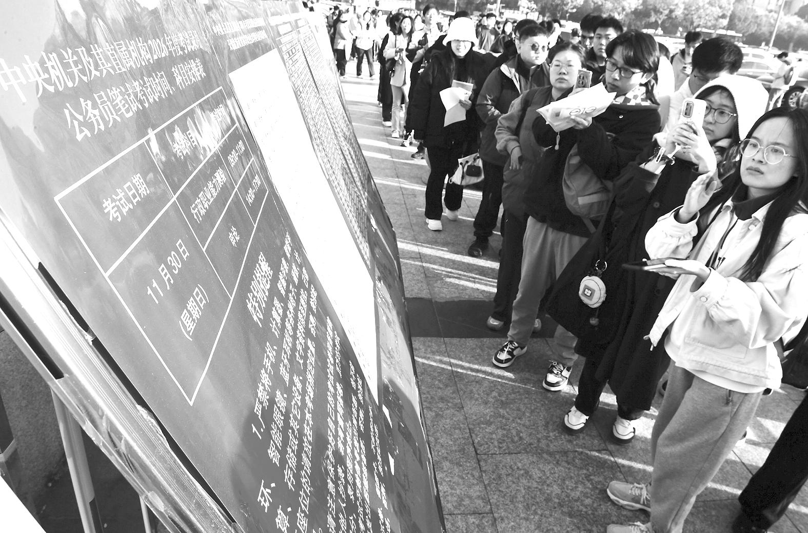 中央机关及其直属机构2026年度考试录用公务员公共科目笔试11月30日在全国31个省(自治区、直辖市)的250个城市、109948个考场同时举行,283.1万人参加考试,参考率约为87.4%,参加考试人数与录用计划数之比约为74:1,有28万名监考、巡考和考务工作人员提供服务保障。 (新华社发 还月亮 摄)