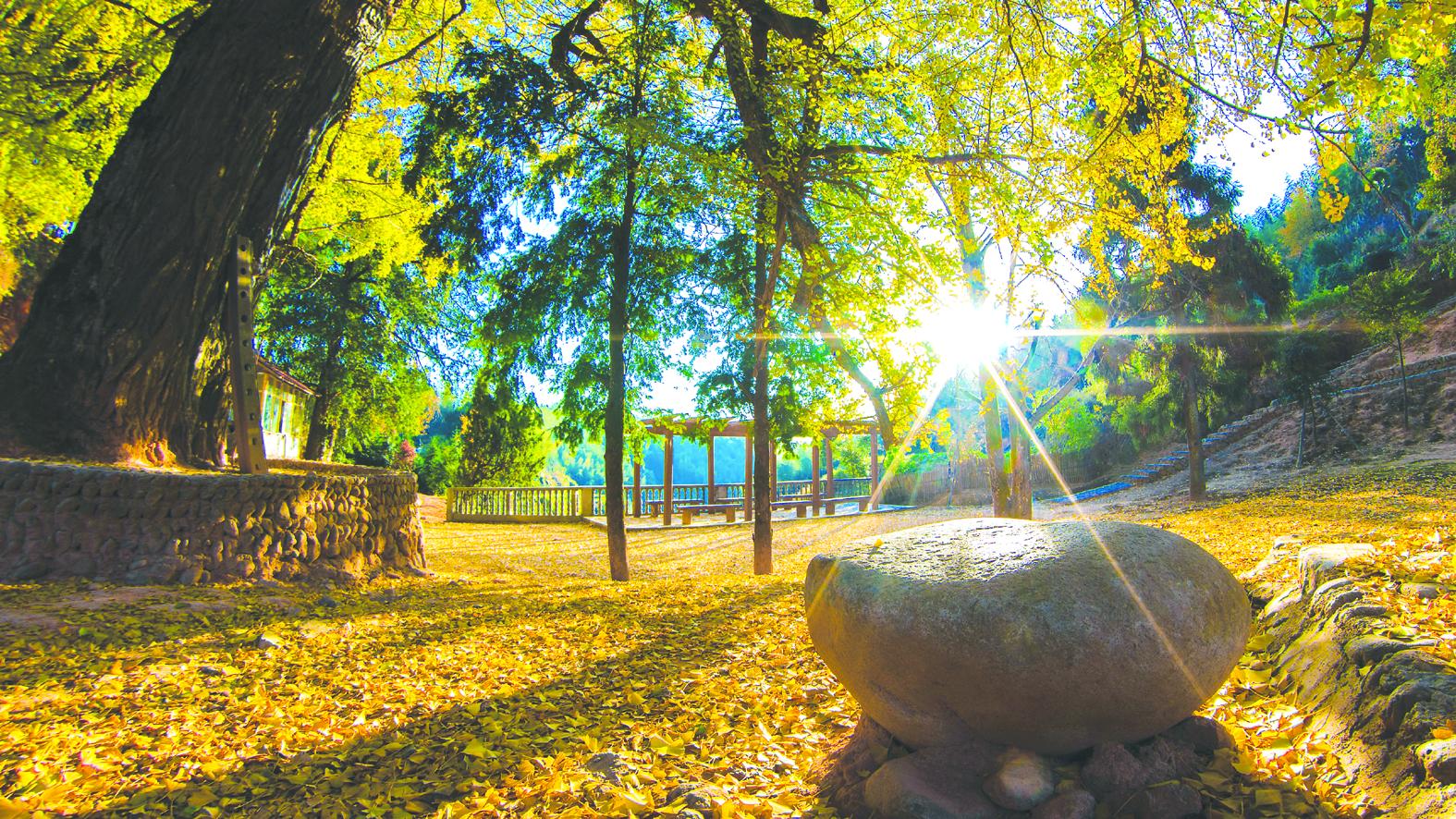 ?浦城县九牧镇渭潭村吴墩头的千年古银杏树进入最佳观赏期,阳光透过树叶撒下“一地碎金”,是赏银杏的宝藏地。 (陈煌 摄)
