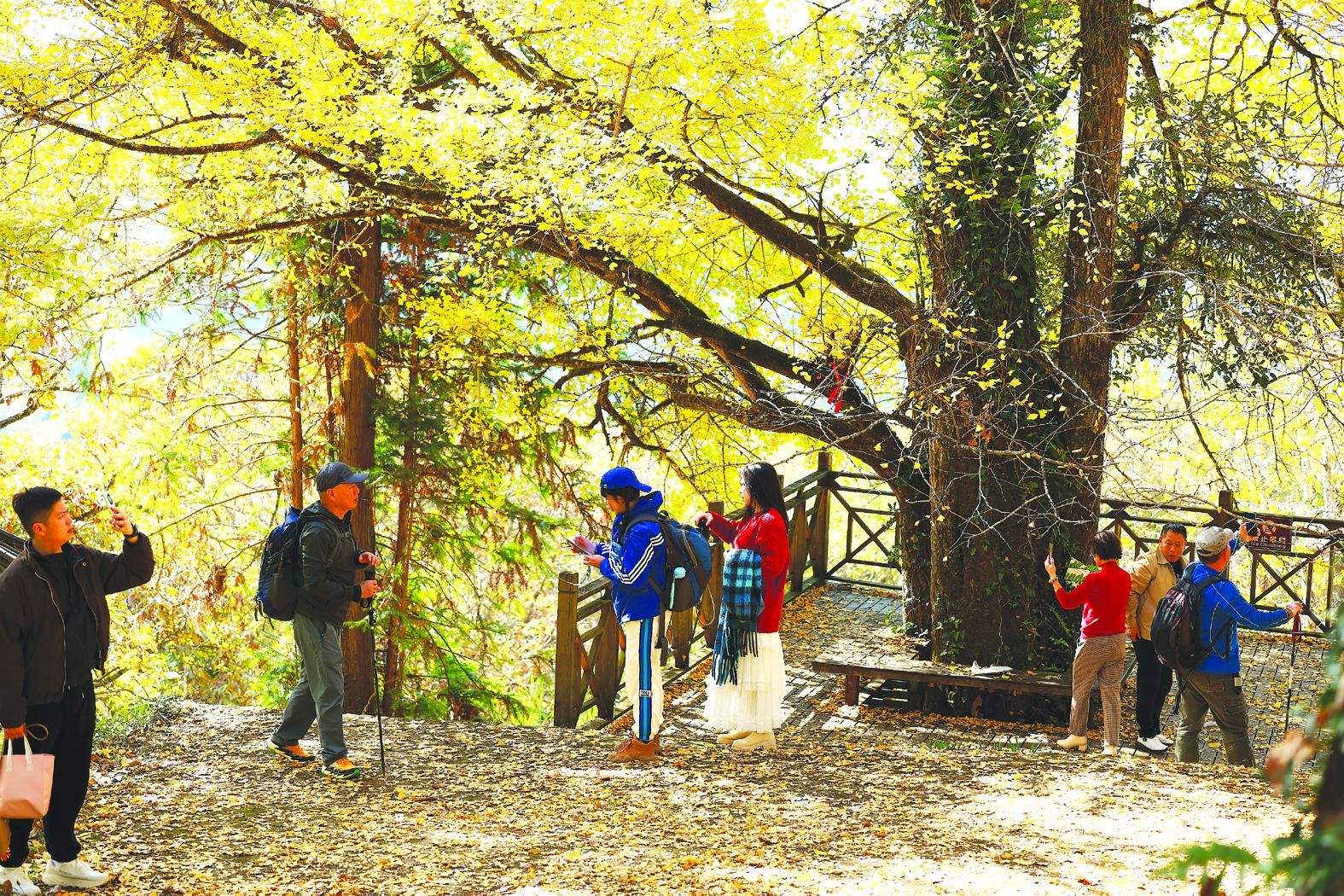 ?近日,顺昌县天台山银杏林进入最佳观赏期,金黄色杏叶铺满山野,成为初冬的一道美景,吸引各地游客慕名而来,在金黄色杏林间感受自然美景。图为游客在银杏林下畅游。 (徐华山 摄)