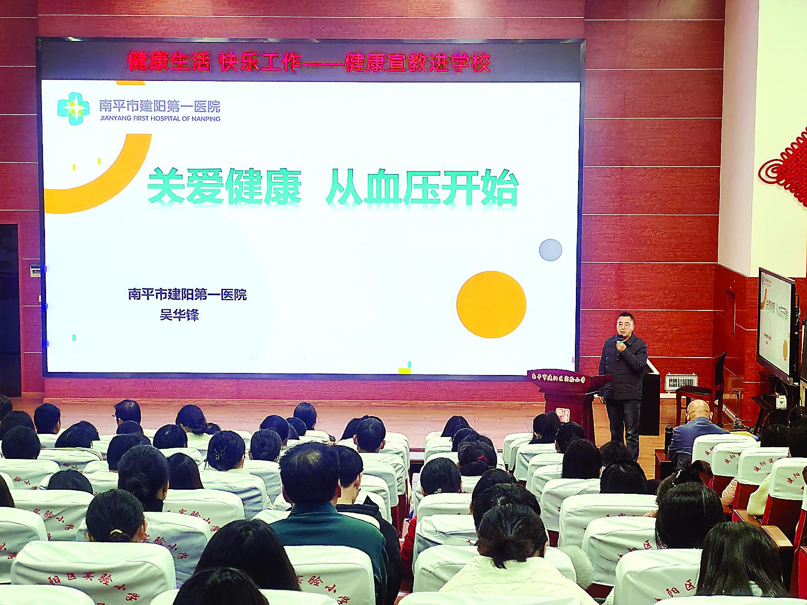 为进一步关爱教职工身心健康,普及高血压慢性病防治知识,12月9日,由建阳区教育局、区卫健局、区总医院联合举办的“健康生活 快乐工作——健康宣教进学校”讲座在建阳区实验小学景贤校区开讲。建阳区总医院副院长、第一医院心血管内科主任医师吴华锋通过图文并茂的方式为大家科普高血压的危害及防治,本次活动共计200余名教师参与,有效提升了大家对高血压的认知和自我健康管理意识。 (刘智敏 叶建容 摄)