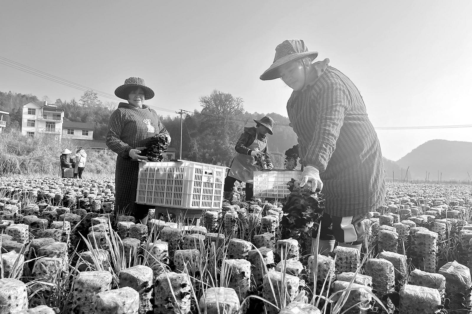 为提高土地利用率,浦城县积极利用冬闲田种植油菜、白萝卜、菌类等作物,进一步拓宽农户增收渠道。图为日前,山下乡水门村的田地里,农户正在采摘黑木耳。 (吴建琼 张莎 邱春静 摄)
