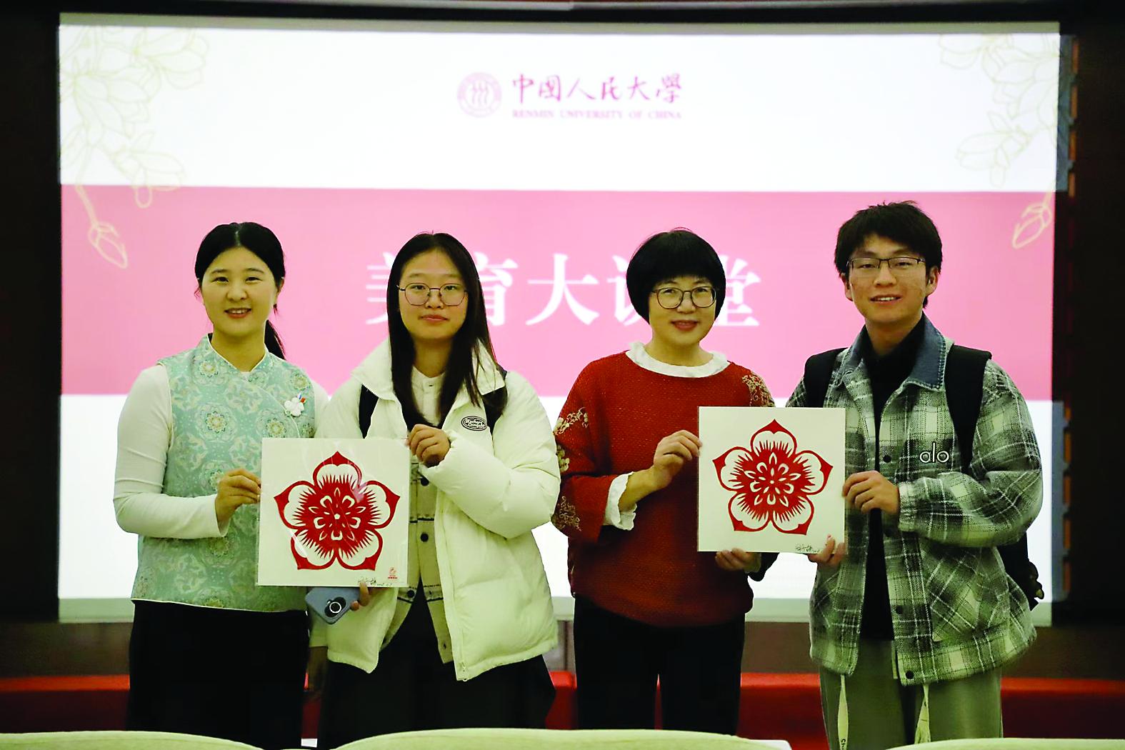2025年11月,周冬梅在中国人民大学开展浦城剪纸专题演讲,王旭(左一)辅助演讲。