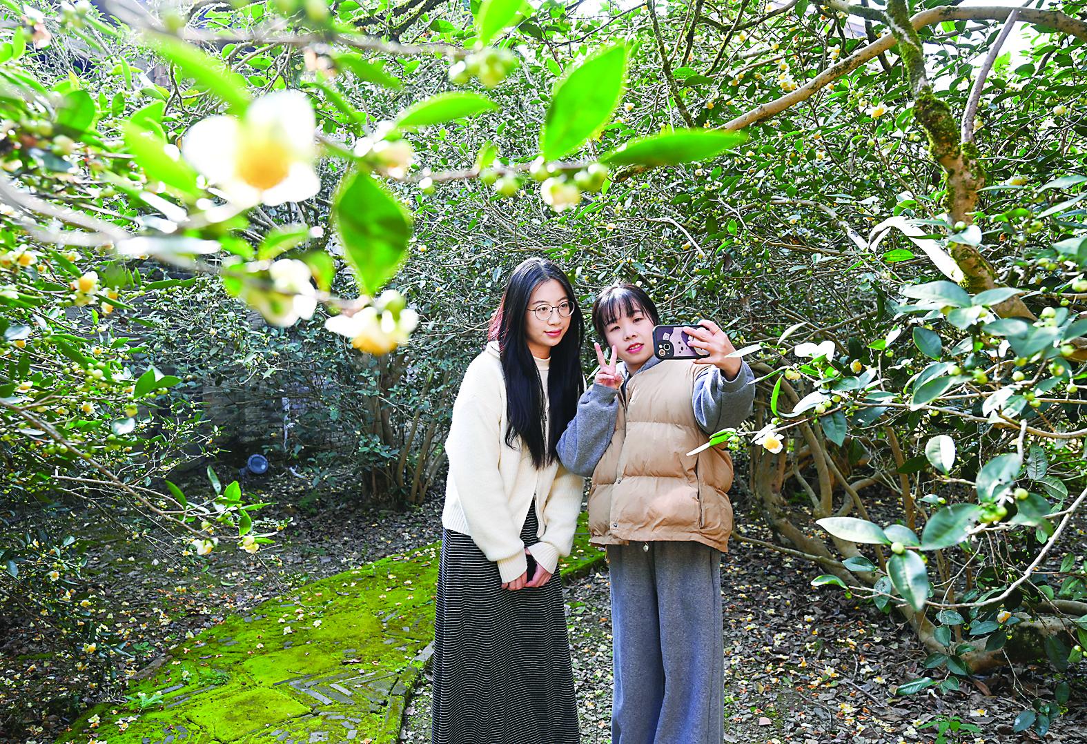 近日,位于建阳区书坊乡的百年水仙茶园茶树花盛放,吸引不少市民游客前来打卡。图为游客市民在茶树花前拍照留念。