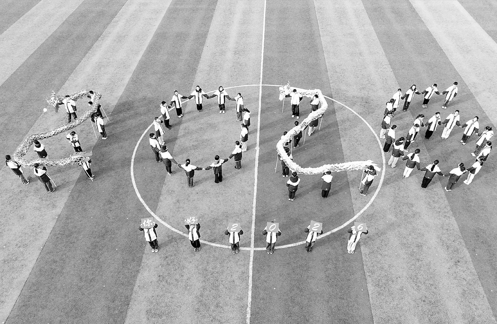 2025年12月31日,江苏省泰州市海陵区九龙实验学校学生在操场上舞龙迎新年(无人机照片)。