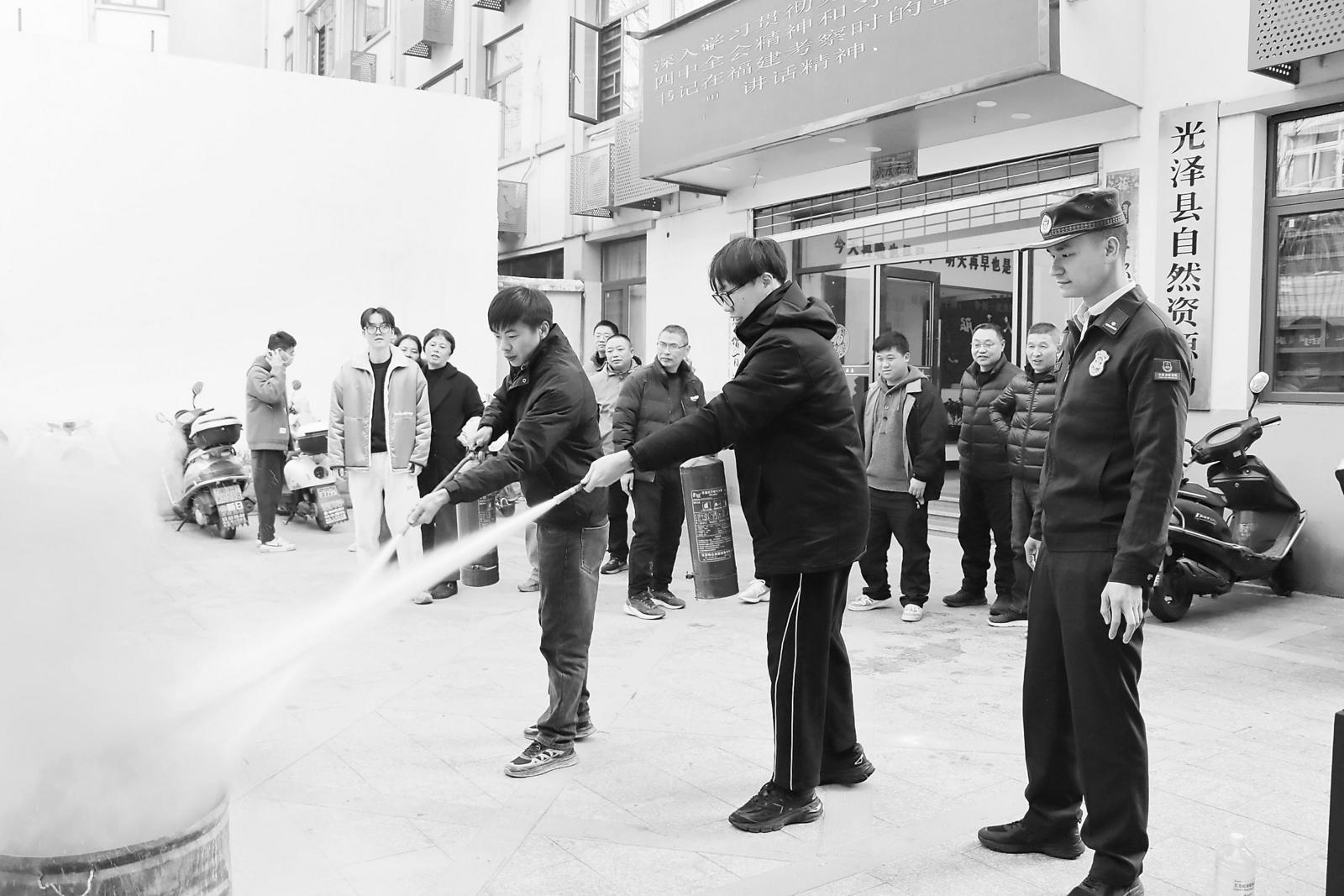12月17日,光泽县消防救援大队到县自然资源局开展消防安全“明白人”培训,30余名干部职工参加培训。图为消防指战员指导参训人员如何正确使用灭火器。 (陈芳芳 摄)