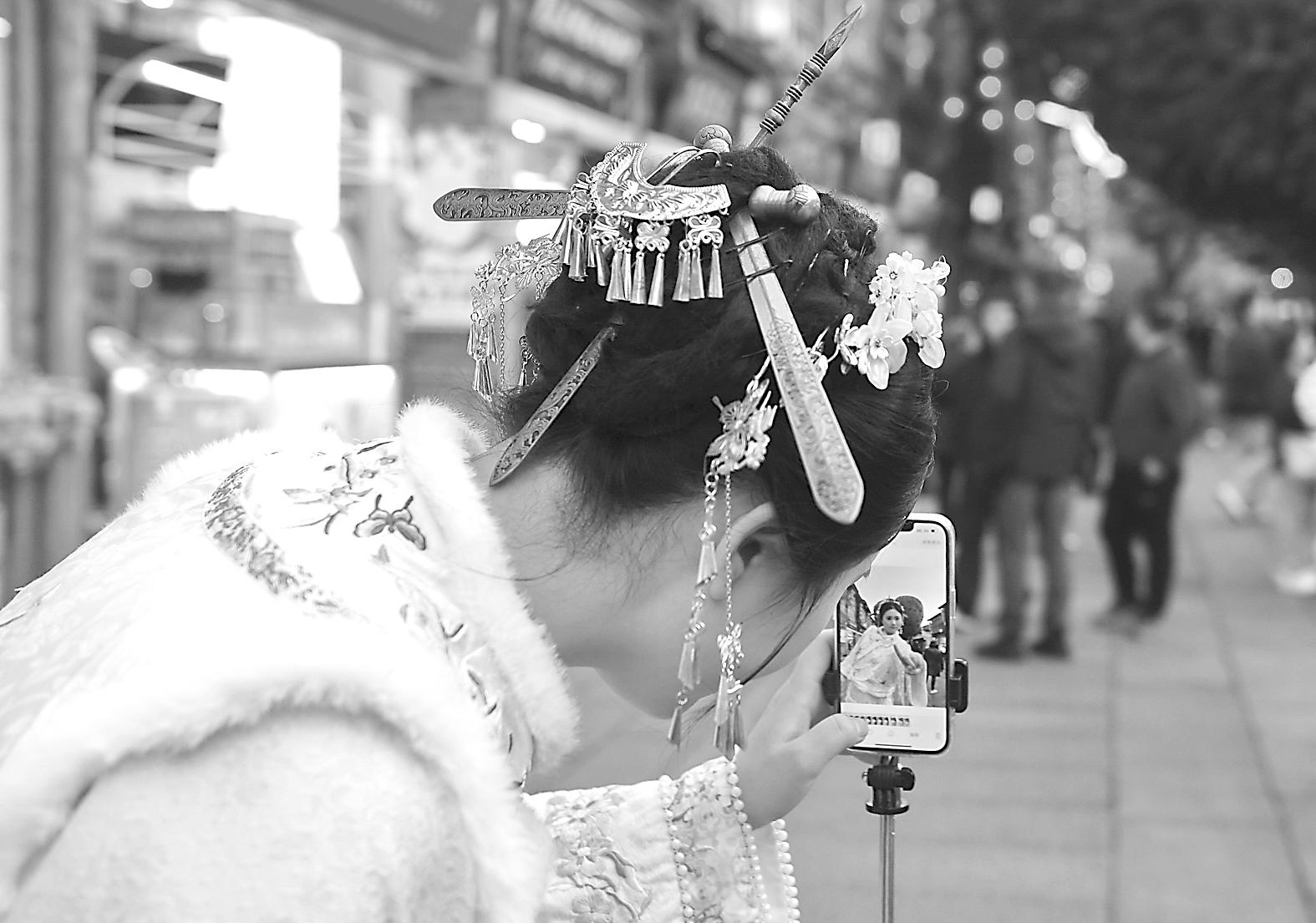 1月9日,游客头戴“三条簪”在福州三坊七巷南后街爱心树前打卡拍照。福州“三条簪非遗IP”入选全国“非遗融入现代生活”典型创新实践名单。