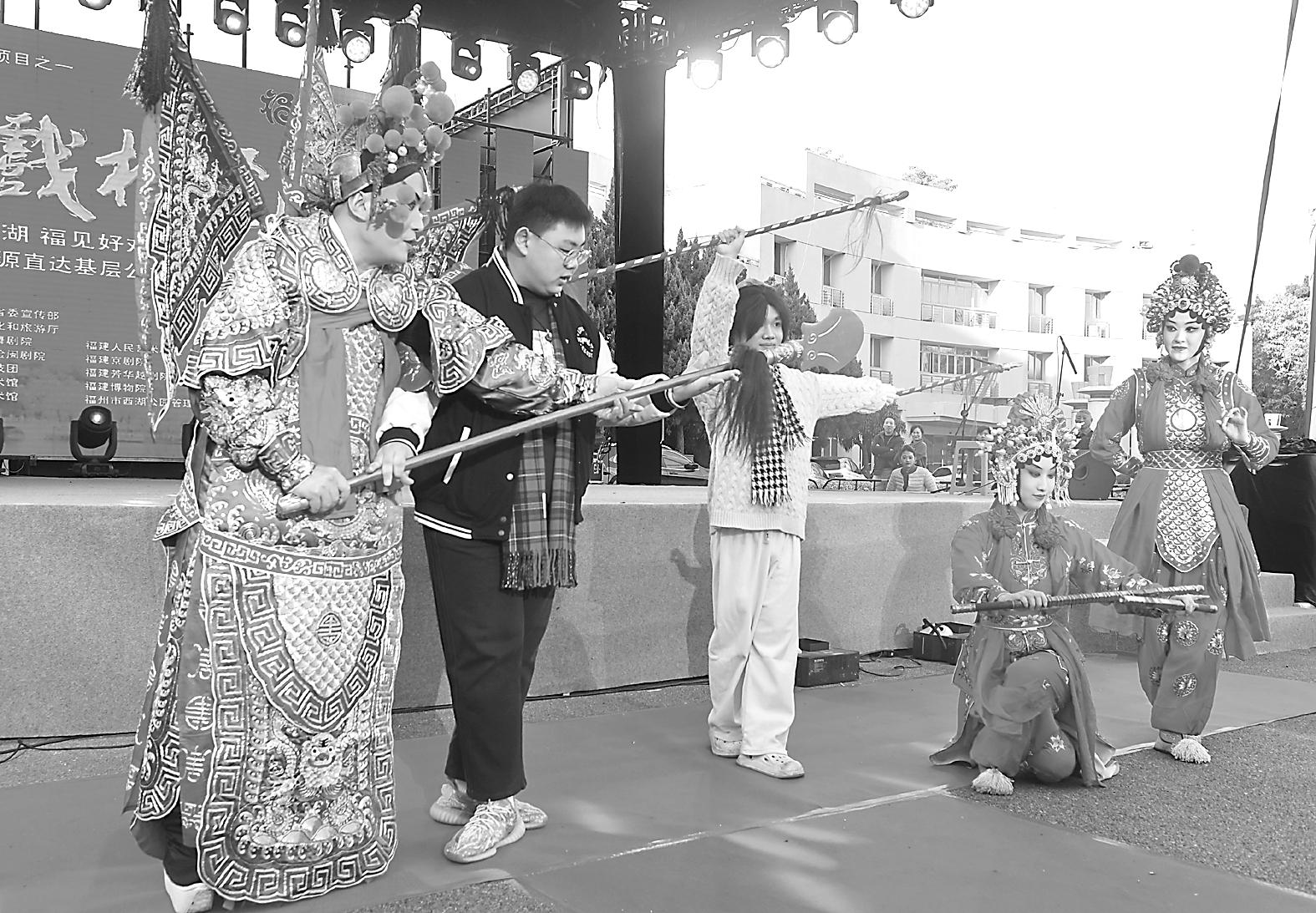 1月10日,在福州西湖公园“周末戏相逢”福建优质文化文艺资源直达基层公益性演出现场,演员与市民开展互动。 (新华社记者 林善传 摄)