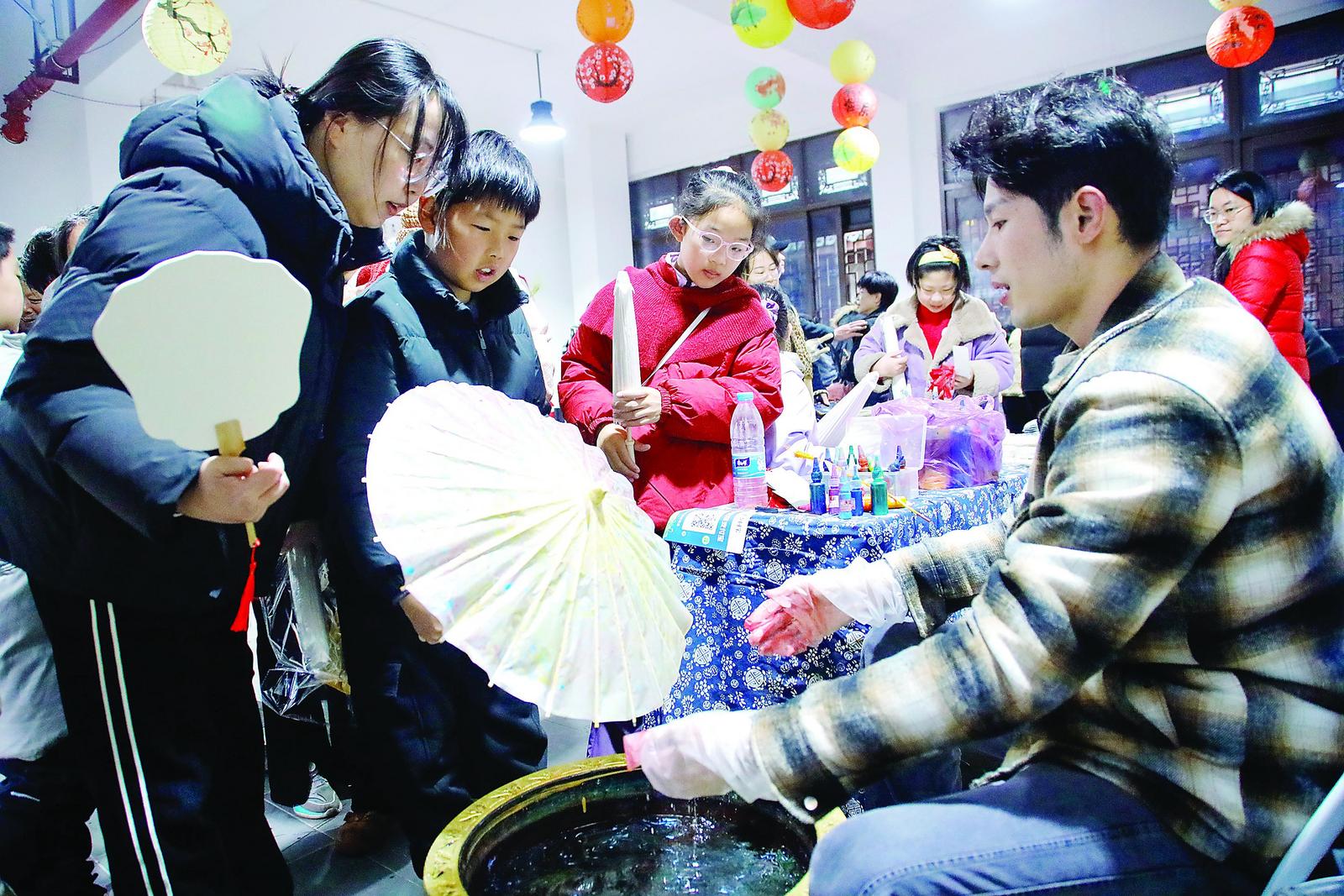 1日,顺昌县龙湖湾城市客厅热闹非凡,写春联、染漆扇、油纸伞漂漆,市民沉浸式体验传统非遗技艺,畅享别样元旦。图为市民在体验市级非遗“洋口油纸伞”制作技艺。 (朱城铖 朱宇 摄)